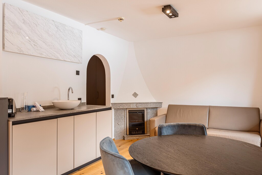 The charming Saalbach Suite offers a cozy and comfortable retreat for up to 4 people, featuring a living/dining room, a sleeping area, a modern bathroom, and a private balcony or terrace. The suite is equipped with thoughtful amenities, including a coffee capsule machine, kettle, fridge, sink, toaster, plates, cups, glasses, and cutlery, though cooking facilities are not available. The suite’s tasteful furnishings and access to an in-house wellness and fitness area ensure a relaxing and enjoyable stay in the heart of Salzburg Pinzgau.
