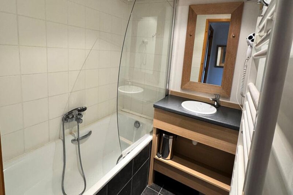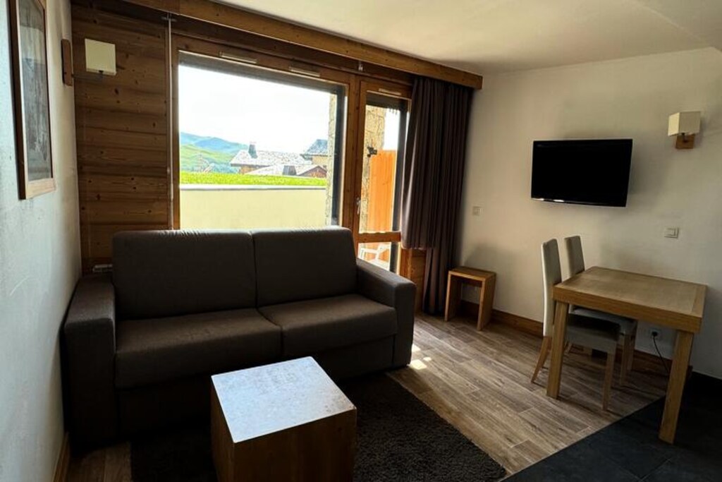 In the heart of the breathtaking Belle Plagne, this charming studio apartment offers a cozy retreat at the foot of the slopes. Imagine waking up to the serene beauty of snow-covered mountains, stepping onto your private balcony to soak in the southwest-facing views, and heading straight into a day of alpine adventure. With its prime location on the third floor of a residence equipped with direct ski access, this property is perfect for those seeking convenience and comfort in the French Alps. \n\nDesigned to accommodate up to four guests, the apartment features a thoughtfully arranged sleeping alcove with bunk beds and a living room with a comfortable double sofa bed. The open-plan kitchen is fully equipped with modern amenities, including a ceramic hob, dishwasher, oven, microwave, and refrigerator with freezer, making it easy to prepare hearty meals after a day on the slopes. The bathroom includes a bathtub and hairdryer, while a separate WC adds to the practicality of the space. Bed linen, towels, and duvets are provided to ensure a hassle-free stay.\n\nThe residence itself boasts exceptional facilities, including a heated indoor swimming pool and a wellness center with a sauna, jacuzzi, hammam, and experience shower. Ski lockers on the first floor offer convenient storage, and the nearby shops, located just 100 meters away, provide everything you need for your holiday. Free Wi-Fi keeps you connected, while pets are welcome for a small supplement, making this a truly inclusive destination.\n\nWhether you’re here to ski the pristine slopes, relax in the wellness center, or simply enjoy the picturesque surroundings, this Belle Plagne studio promises an unforgettable alpine escape. With its blend of modern amenities and stunning natural beauty, it’s the perfect choice for couples, families, or friends looking to create lasting memories in the French Alps.