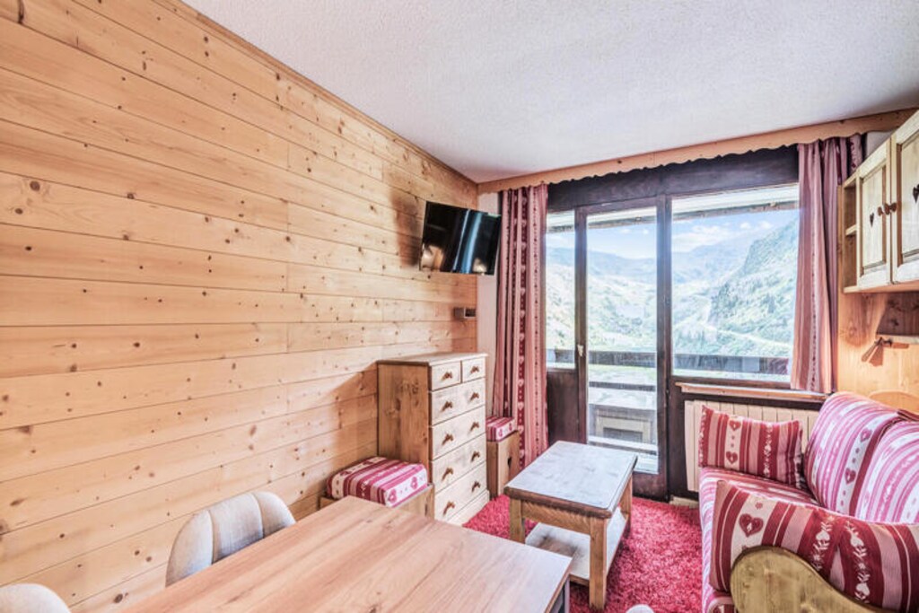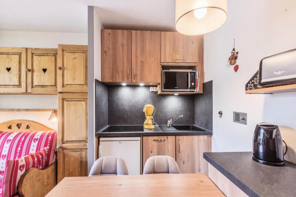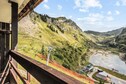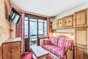 The apartment features a fully equipped kitchen area with a stove and fridge, ideal for preparing your meals. The spacious balcony with a table and chairs offers a scenic mountain view, perfect for relaxing after a busy day. Guests also enjoy convenient access to a ski locker, elevator, and a reserved parking space in nearby parking facilities.