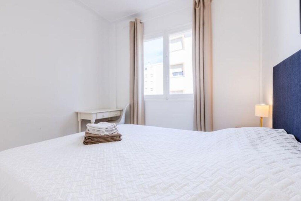 Step inside this fully renovated apartment and discover a spacious living area thoughtfully divided into a cozy lounge, a dining space for four, and a fully equipped kitchen with modern appliances, including an oven and dishwasher. The first bedroom features two single beds and ample storage, while the second bedroom boasts a queen-size bed and a dedicated desk area, ideal for business travelers. The apartment is completed by a sleek shower room with a toilet, ensuring every comfort is met. High-speed Wi-Fi, reversible air conditioning, and a secure parking space further enhance your stay.