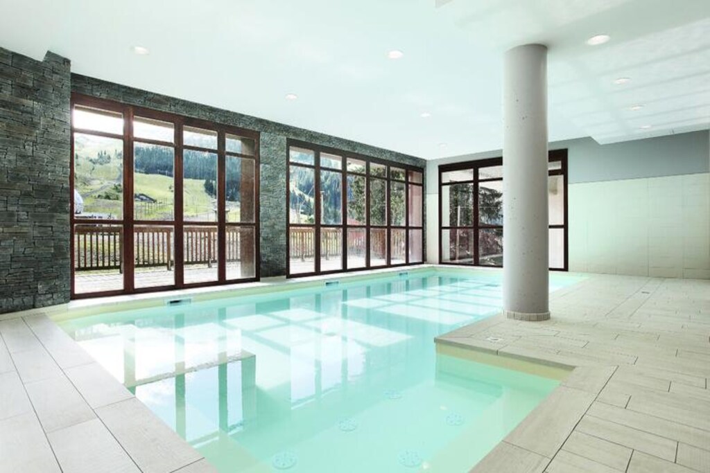 Each apartment includes an equipped kitchen, a bathroom, a WC, and a balcony. On-site amenities include a 40m² indoor heated swimming pool with a whirlpool bath, an 80m² indoor beach, and a relaxation area with a hammam and sauna. Wi-Fi and bed linen are included. Towels, a baby kit, and covered parking are available for an additional fee. A deposit and tourist tax are payable on site. All apartments have a television.