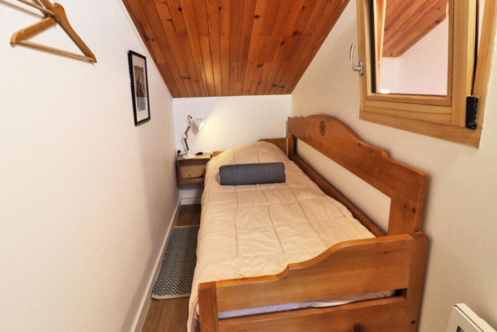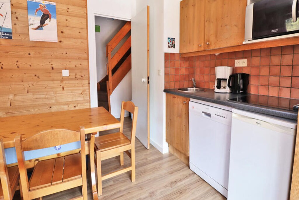 High above the shimmering slopes of Châtelet, this charming duplex apartment offers a cozy alpine retreat for up to six guests. With its south-facing balcony, you can soak in the breathtaking mountain views while sipping your morning coffee or unwinding after a day of adventure. Whether you're here for skiing, hiking, or simply relaxing, this residence places you at the heart of the action with the ski lifts just 100 meters away and the convenience of the Châtelet shopping center right at your doorstep. The ESF meeting point and Piou-Piou kindergarten are also nearby, making it an ideal choice for families with young children. \n\nThe apartment spans two levels, thoughtfully designed to maximize comfort and functionality. On the first level, you'll find a welcoming living room with a sofa bed and trundle bed, a cozy cabin with bunk beds, and a well-equipped kitchenette featuring modern appliances such as a dishwasher, microwave, and Nespresso coffee maker. A sleek shower room with a toilet completes this floor. Upstairs, accessible via steep stairs, you'll discover a small bedroom with a double bed, a single-bed cabin, and an additional bathroom. Flat-screen TV, heating, and thoughtful touches ensure a relaxing stay. \n\nStep outside, and you'll find everything you need within easy reach. The slopes are just a short walk away, allowing you to ski in and out with ease. The shuttle bus stop is conveniently located 50 meters from the supermarket, connecting you to nearby attractions and facilities. Whether you're exploring the pristine trails or indulging in local cuisine, this location offers the perfect blend of adventure and convenience. \n\nExperience the magic of the French Alps in this delightful home-away-from-home, where every moment is framed by the beauty of the mountains and the warmth of a welcoming space.
