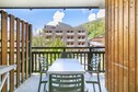 The apartment features a warm and inviting living space with modern furnishings, a flat-screen TV, electric heating, and Wi-Fi access. Step onto the private balcony to take in fresh alpine air or enjoy your meals outdoors with the provided furniture. The building includes elevator access, ensuring comfort for all guests.