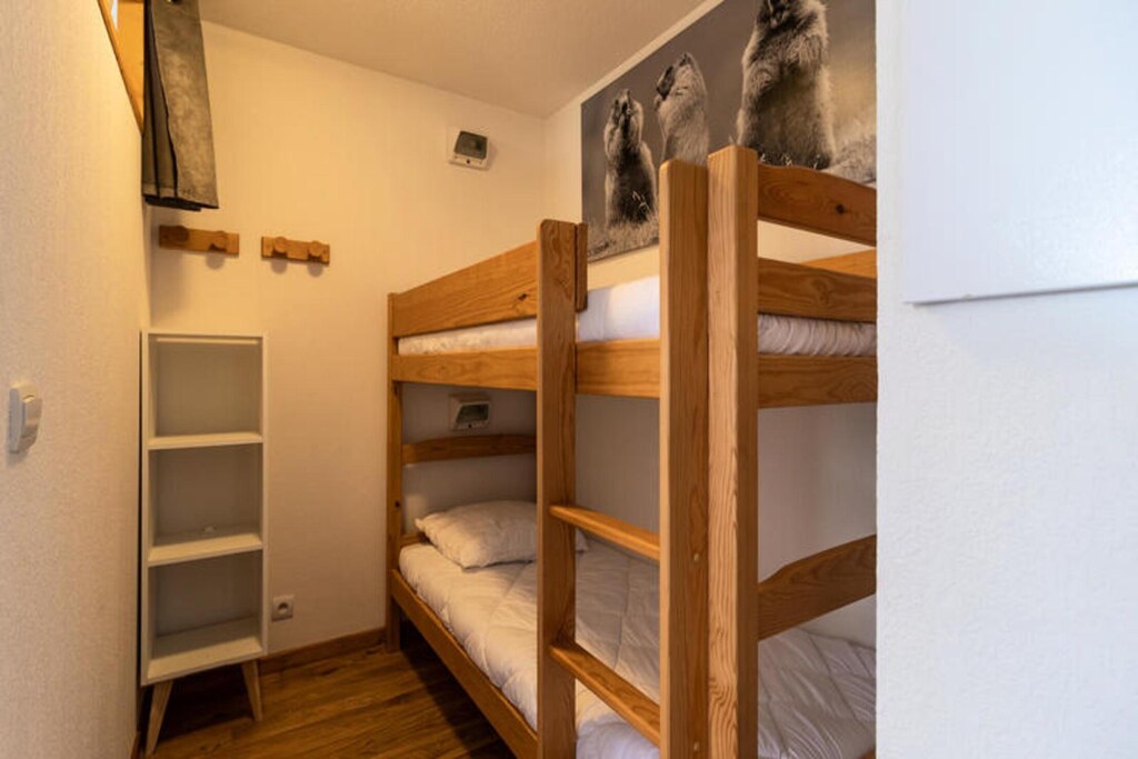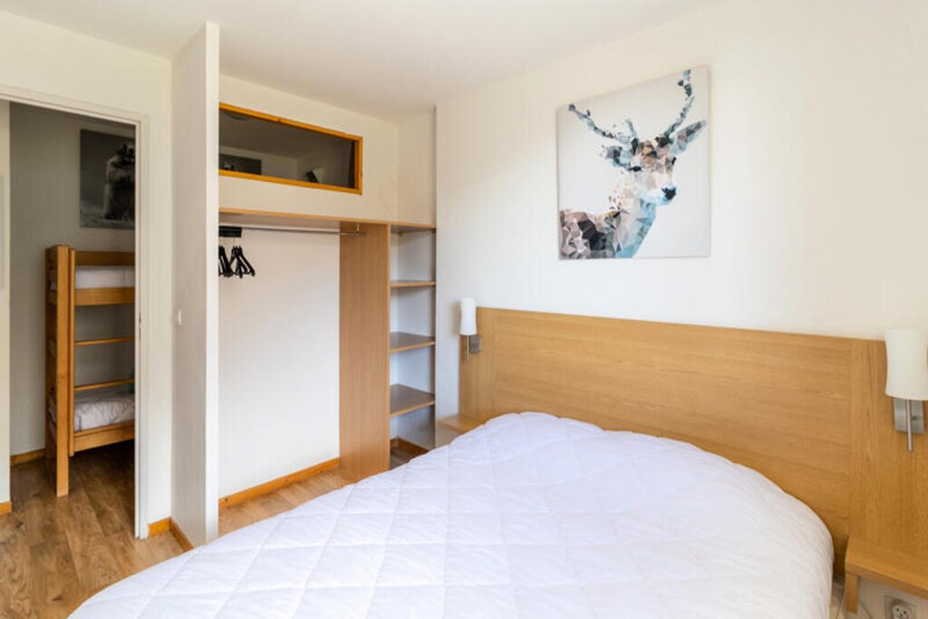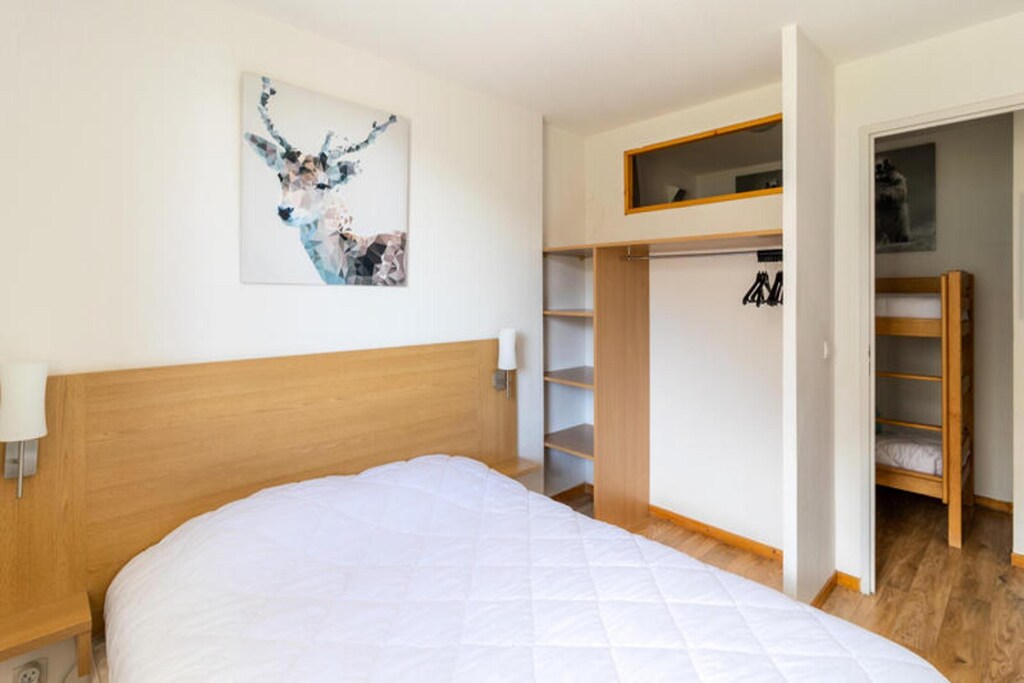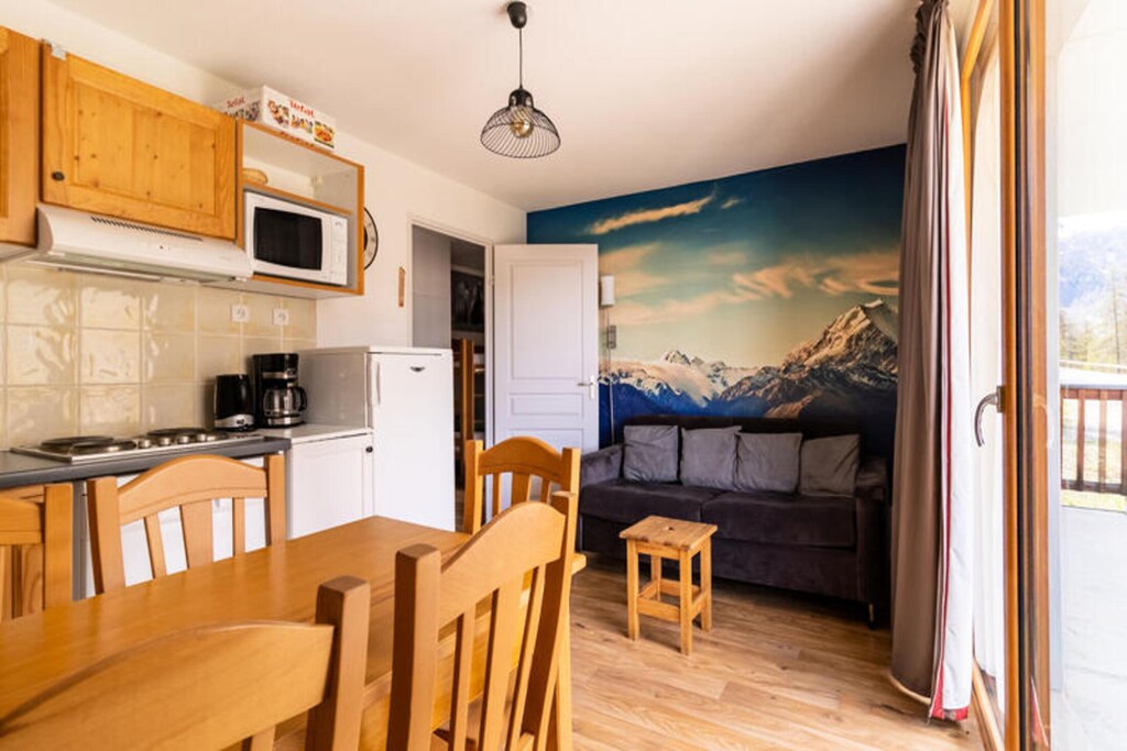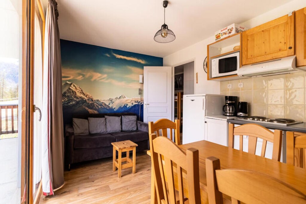 Property, along with its tranquil setting, offers a well-equipped 2-room apartment that can accommodate up to 6 guests. The apartment features a living room with a sofa bed and a separate bedroom with a double bed, while a sleeping area with two single bunk beds provides additional space. A large balcony facing northwest offers views of the surrounding peaks and valley. For convenience, the apartment includes a bathroom with a bathtub, separate WC, and a dining area. Guests can enjoy complimentary access to the heated indoor swimming pool located in a nearby building, which is available seasonally. Additional amenities like a 4G Wi-Fi box, a raclette machine, a microwave, and a hairdryer enhance the comfort of the stay. Pets are not mentioned, and additional items such as linens or housekeeping can be inquired about.