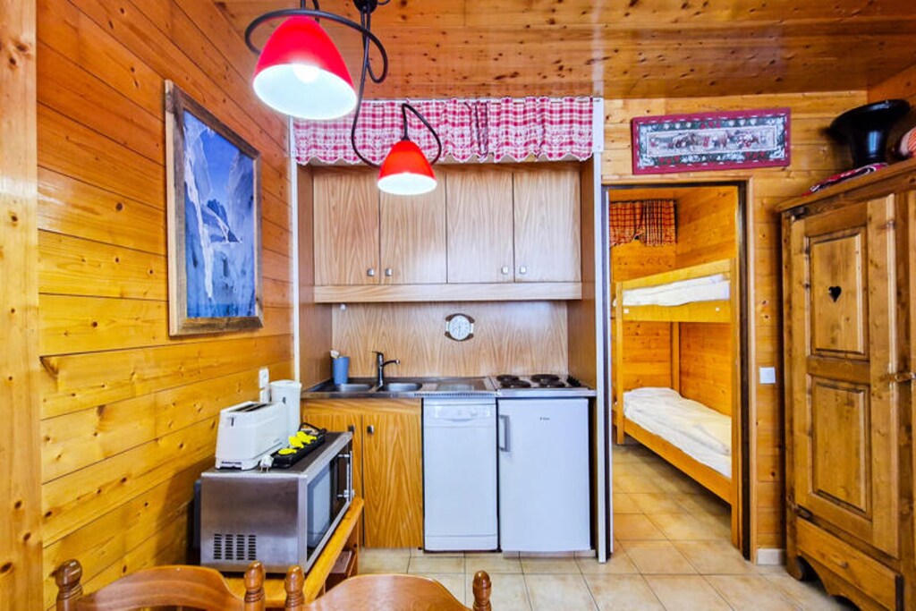 This thoughtfully designed 25 m² studio, located on the 6th floor, is equipped to accommodate up to four guests. The space features a comfortable living room with a double sofa bed and a cozy entrance area with bunk beds, making it ideal for families or small groups. The kitchenette is fully equipped with a combi oven, four electric hobs, and a dishwasher, ensuring you can prepare hearty meals after a day on the slopes. Modern amenities like a flat-screen TV, a spacious shower room with a washing machine, and ski lockers add to the convenience and comfort of your stay. For your peace of mind, sheets, towels, and cleaning services are included, so you can focus entirely on relaxation and adventure.