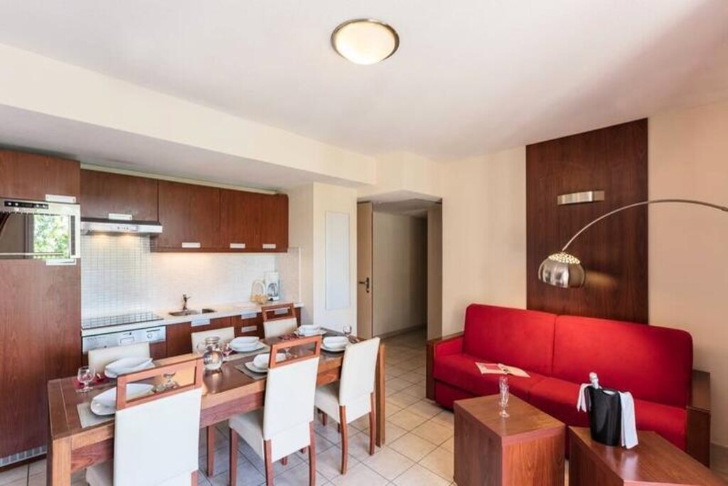 The apartment comes with a fully equipped kitchen, allowing you to prepare meals with ease. Additional amenities include a 600m² outdoor swimming pool (seasonal), a children's pool, water jets, and a solarium terrace with deck chairs. For relaxation, there is a wellness area with a sauna, whirlpool bath, and hydromassage shower. Sports enthusiasts can enjoy the tennis court and multi-sport field, while younger guests will appreciate the play area.