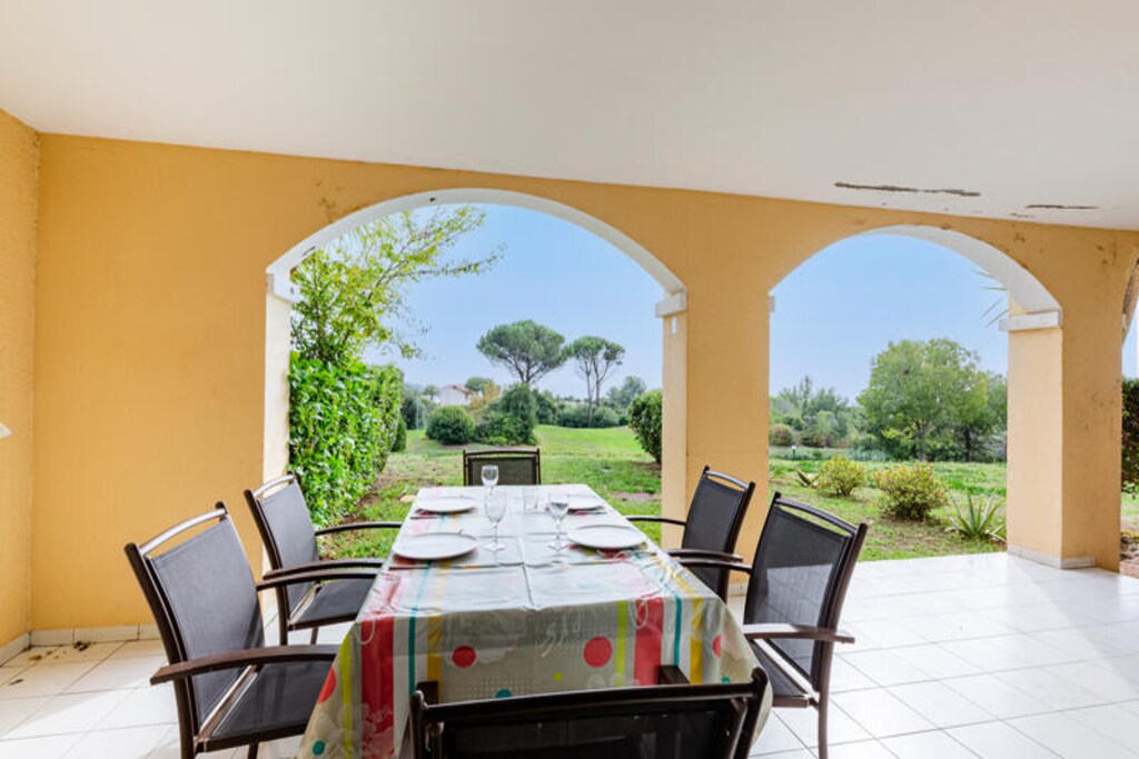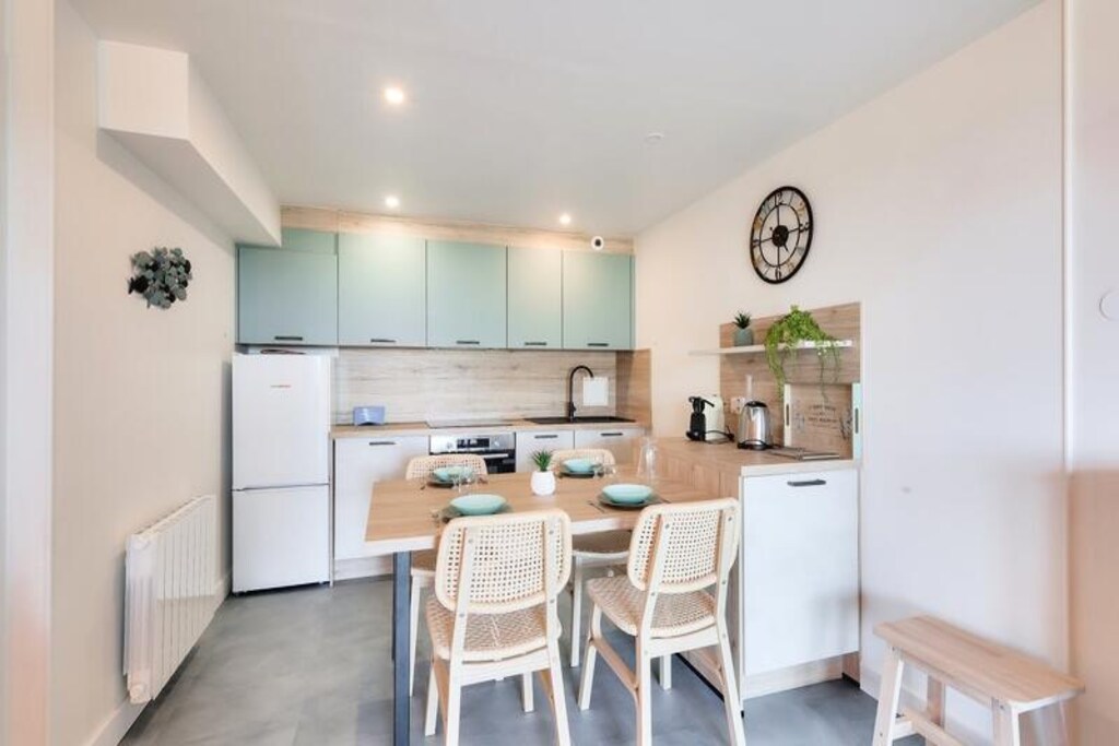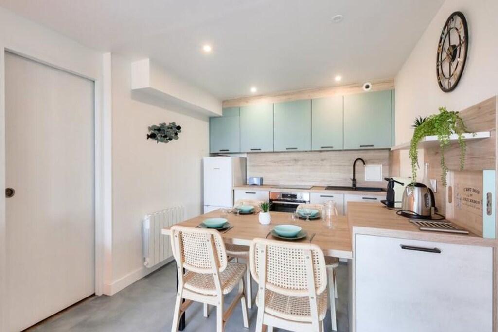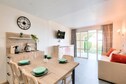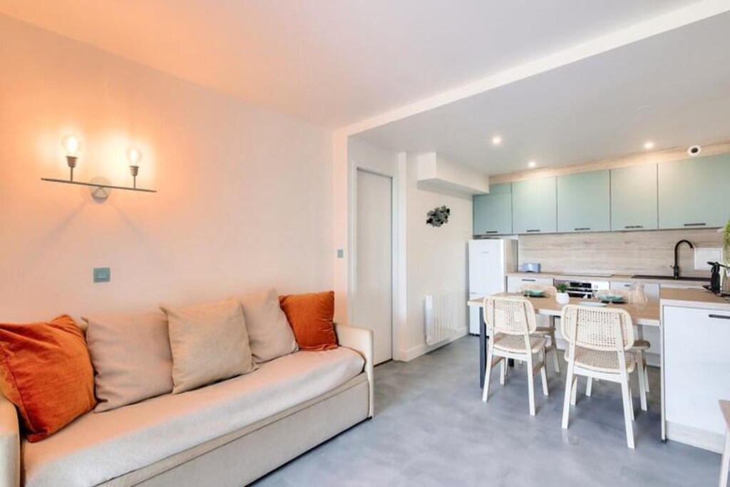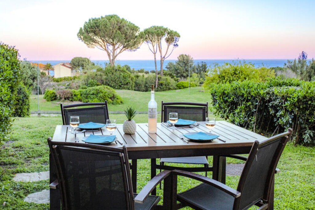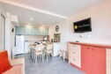 This 37m² apartment comfortably accommodates up to 5 people, featuring a living room with a sofa bed, a cabin area with two bunk beds, and a double bedroom. The property is pet-friendly (subject to inquiry) and includes a covered parking space. A private terrace offers beautiful sea views to the east, and a garden with a sea-facing orientation provides a relaxing outdoor space. The apartment's bright and modern design ensures a pleasant stay for all guests.