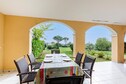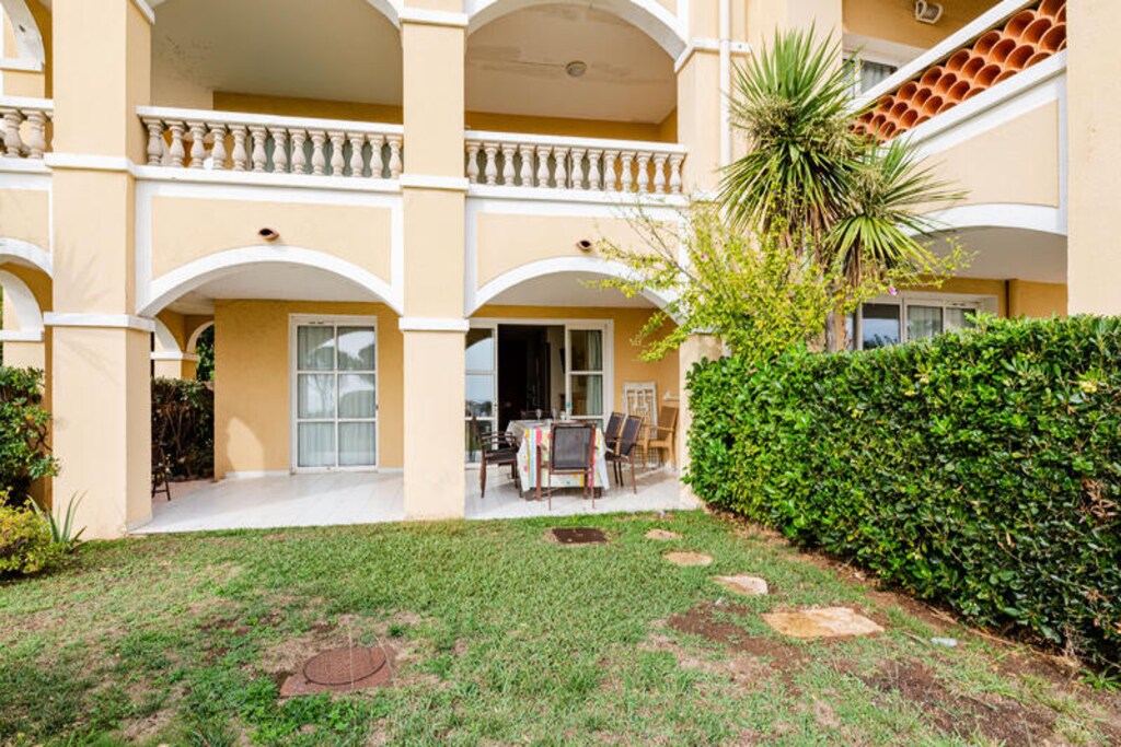 Inside, the apartment features an American-style kitchen with an 8-seat dining table, perfect for family meals. The bathroom includes a bathtub with a column, an electric towel dryer, and a separate toilet. A well-maintained garden with a sea view and a covered terrace enhance the overall experience, making it ideal for a peaceful retreat.