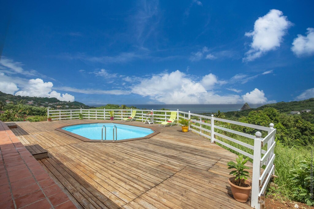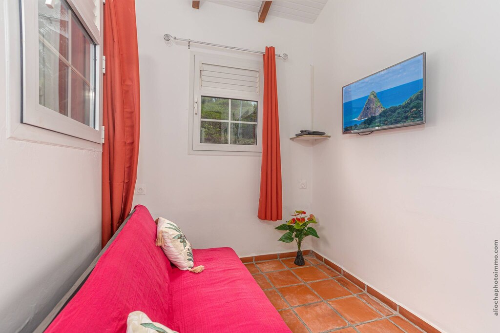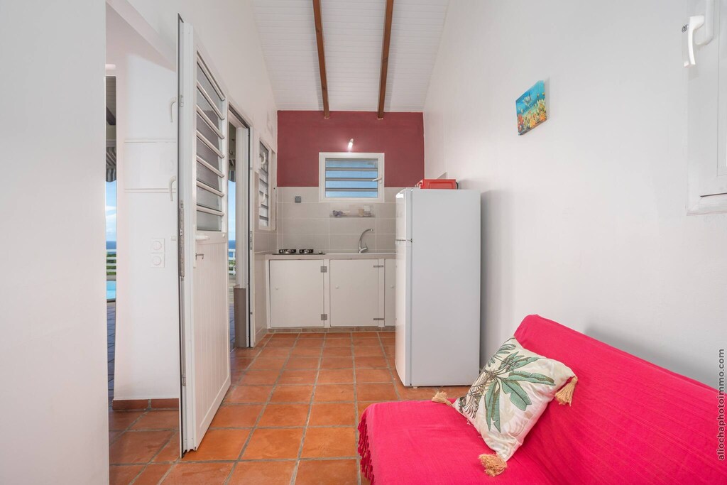 Inside, you’ll find a cozy bedroom with a double bed and a comfortable living space with a sofa bed, perfect for a restful stay. Step outside to relax by the private pool or sip your morning coffee while admiring the view of the iconic Sugarloaf Rock. Just minutes away, explore Anse Charpentier (great for surfers), the swimmer-friendly Raisiniers Beach in Trinité, and scenic hikes through the Philippe Forest. The nearby restaurant Le Point de Vue offers delicious Creole cuisine just a 5-minute drive away.