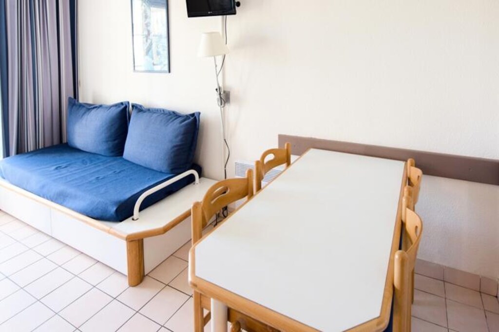 This cozy ground-floor apartment offers a comfortable stay for up to 4 guests, featuring a living room with two sofa beds (one with a trundle bed) and a bedroom with a double bed. It also includes a bathroom with a bathtub, a separate toilet, and a furnished terrace. Pets are allowed in certain accommodations for an extra fee, and Wi-Fi is available for an additional charge. Free parking is provided within the residence.