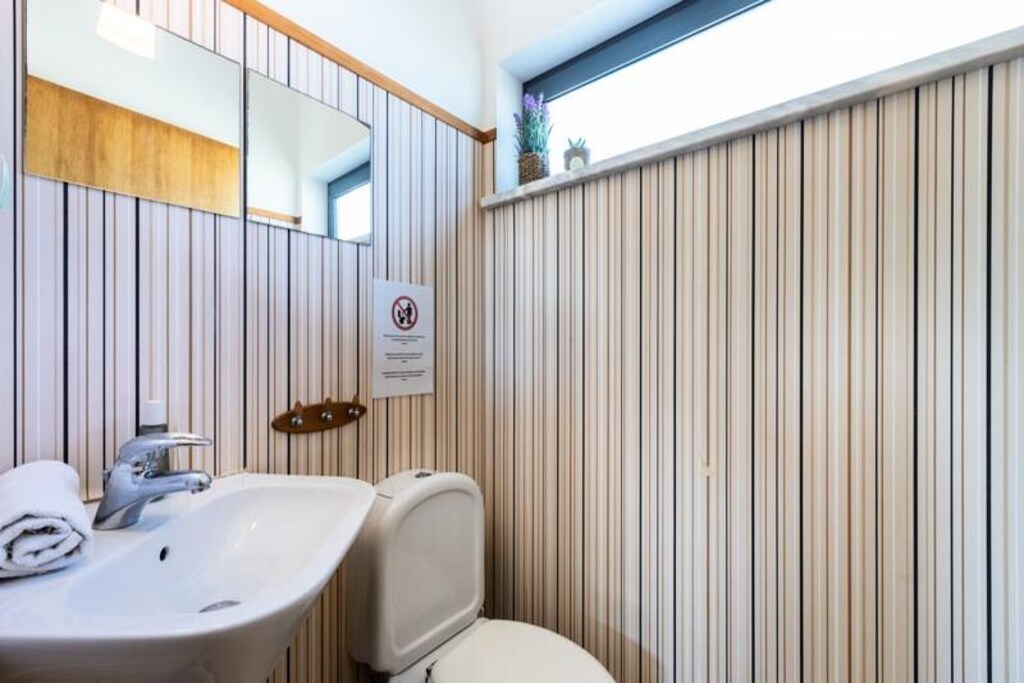 Step inside to discover a bright and airy living space with a cozy fireplace, perfect for unwinding after a day of adventure. The open-plan kitchen and dining area are designed for convivial meals, with large windows framing views of the lush surroundings. Downstairs, three spacious bedrooms provide restful retreats, each with direct access to the garden patio. The master bedroom features an en-suite bathroom, while the other two bedrooms, each with three single beds, share a modern bathroom with a shower.