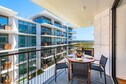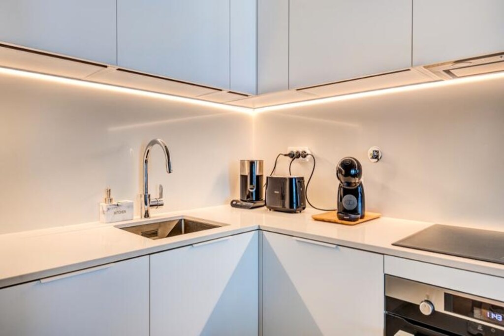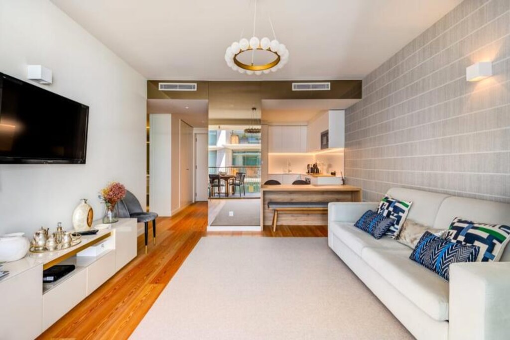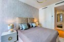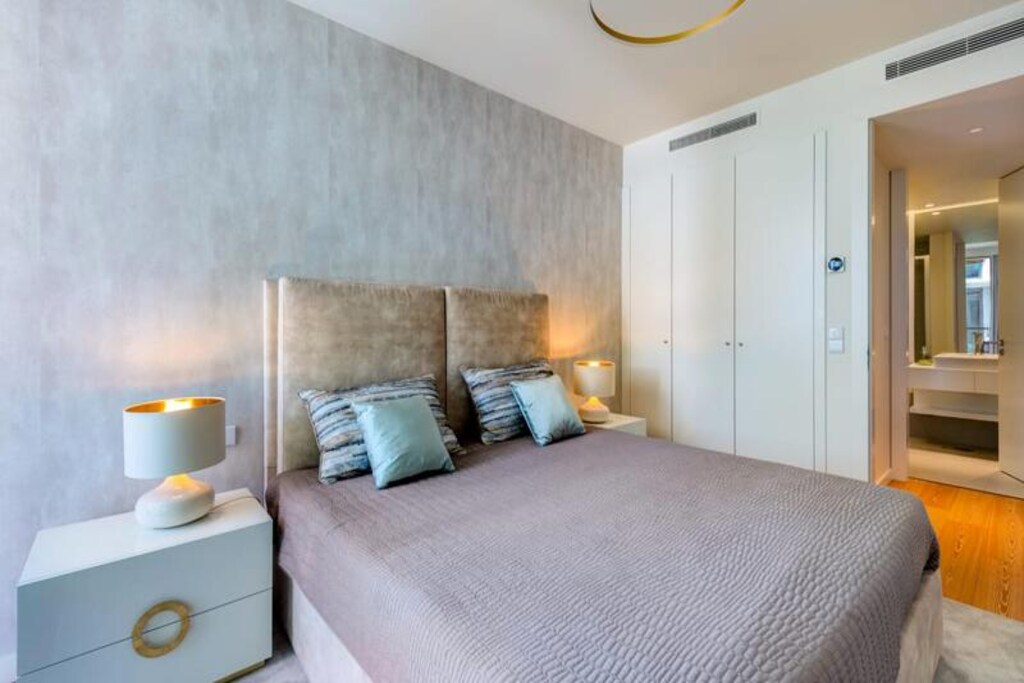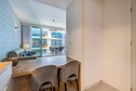 Inside, the apartment welcomes you with a bright, open-plan living space, complete with a fully equipped kitchen featuring high-end appliances and elegant finishes. The master bedroom, furnished with a plush queen-size bed, ensures restful nights, while the stylish bathroom provides both privacy and convenience. Air conditioning in all rooms guarantees comfort year-round, and electric blinds add a touch of modern sophistication.