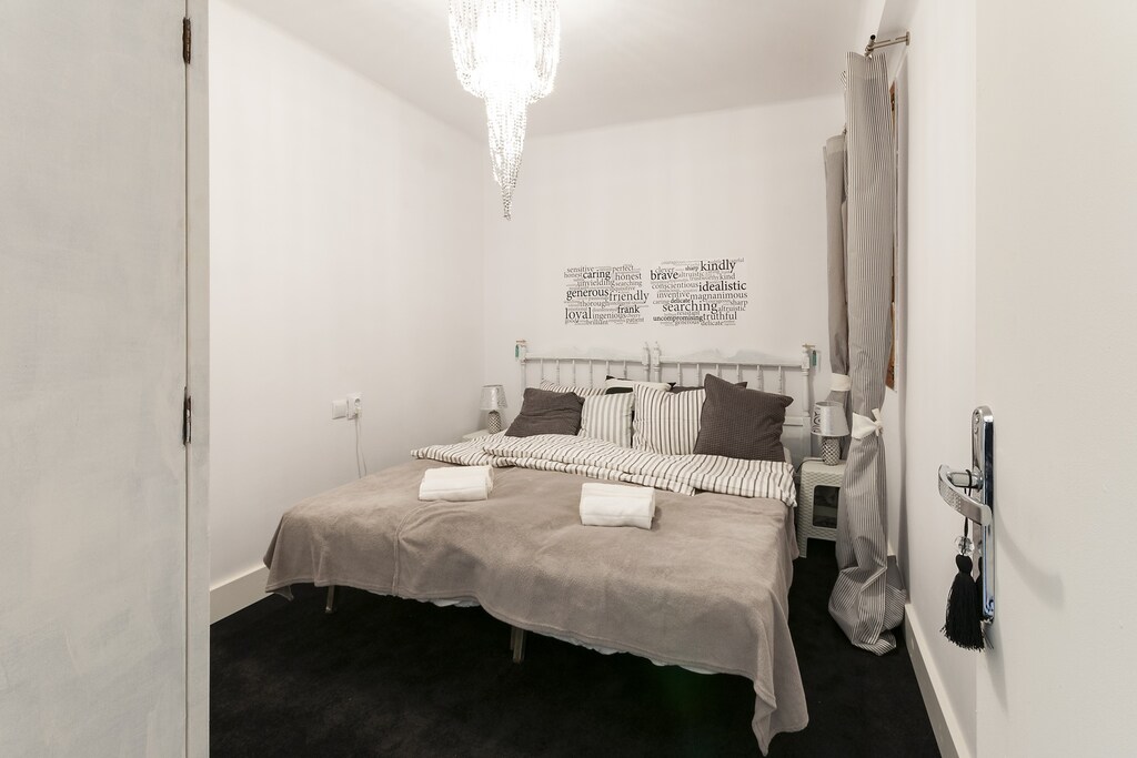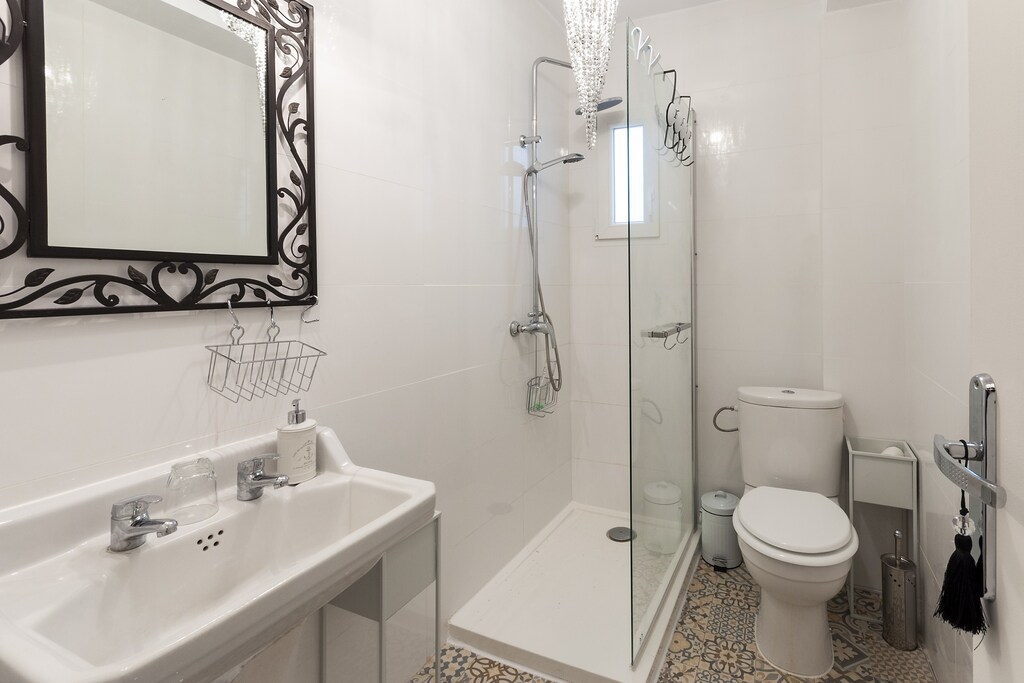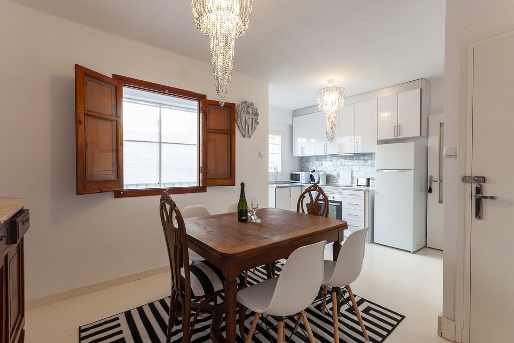 Inside, the perfect combination of styles gives a special character to this apartment, located on the first floor of a building without lift. When you enter, you're welcomed by a modern kitchen -with a ceramic hob- open to the dining area which, on the other hand, boasts an antique furniture. Next, you find the air-conditioned living-dining room where you can organise a great evening or rest watching the TV. Then, the corridor leads to the 3 bedrooms, all with a closet. One of the bedrooms has twin beds, another has a single bed and the last one has a double bed an space for a baby cot -a high chair also is available-. The bathroom in the accommodation has a shower. And the laundry room features a washing machine, an iron and an ironing board.