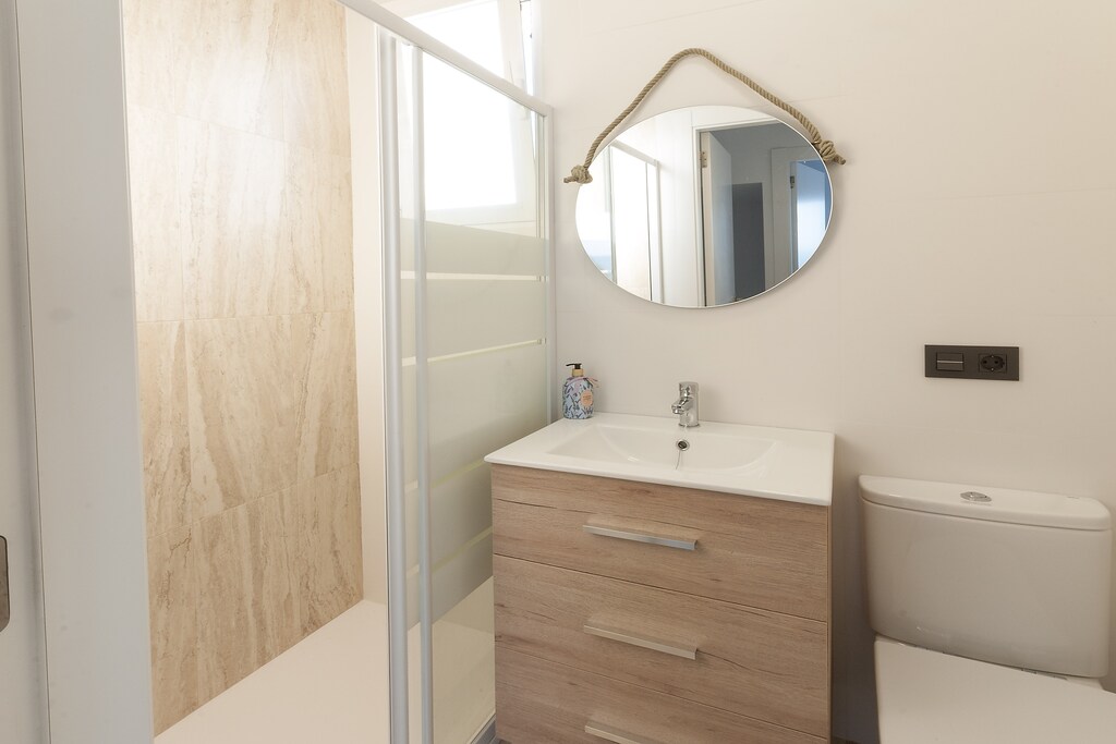 The accommodation features an airy and cosy room where the living room, -with air conditioning and TV-, the dining area and the kitchen are together. The kitchen has an induction top and all you need to cook. Upstairs you have the bathroom of the house -with a shower- and two bedrooms with a closet and a fan each. One of them has a double bed, access to a balcony with sea views and space for a baby cot (a high-chair also is available). The other room features a trundle bed. You'll find also a washing machine, an iron and ironing board.