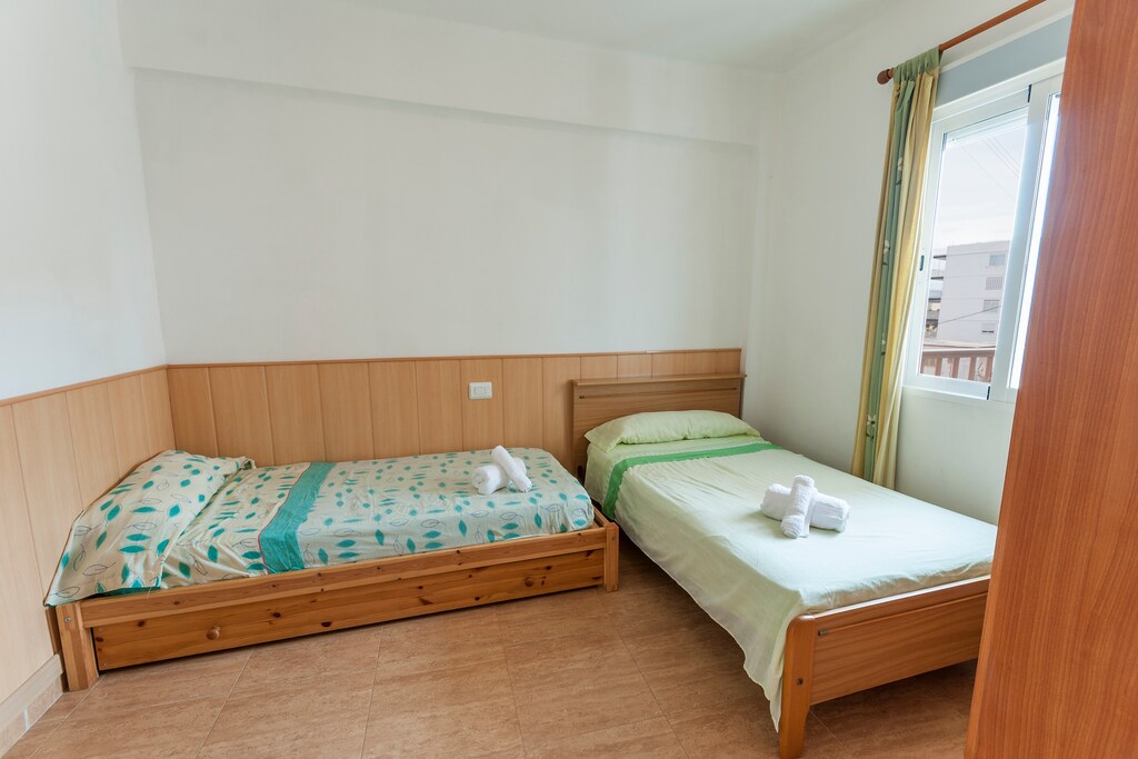 The flat is simply but comfortably furnished, offering a living-dining room equipped with a ceiling fan, a kitchen equipped with a gas hob and some utensils (kettle on request). You can choose between three bedrooms, one with a double bed and en-suite bathroom with shower and the other two with two single beds (90x180). All bedrooms are equipped with fan and wardrobe. Apart from the en-suite bathroom there is another bathroom with bathtub, washing machine, iron and ironing board. If you are travelling with a baby, we provide a cot and a highchair.